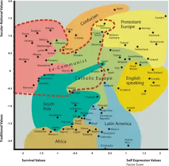Op basis van dit tweedimensionaal spectrum kunnen landen in bepaalde culturele regio’s opgedeeld worden. Volgens de WVS verklaren de twee dimensies meer dan 70% van de grensoverschrijdende varianties in een factoranalyse van tien indicatoren. Deze uitkomst bevestigt de stellingen van Max Weber in de godsdienstsociologie dat religie een sterke invloed op cultuur uitoefent.