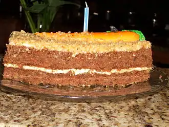 - ↑ Zie Historische Kranten KB, b.v. de rubriek 'De vrouw en haar huis' in de Nieuwe Tilburgsche Courant van 27 juni 1932, waar een recept wordt aangekondigd als een van de 'worteltjesvreemdigheden voor huisvrouwen die graag experimenteeren'. In het Limburgsch Dagblad van 20 maart 1973 wordt het een 'voor ons in Nederland ongewone taart' genoemd.