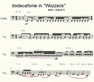 In één scène, namelijk akte 1, scène IV gebruikt Berg een proto-versie van de dodecafonie. Hij initieert de reeks die hiernaast te zien is, maar niet de hele scène, vooral de zanglijn niet, is streng op de reeks gebaseerd. Er wordt vaak gedacht dat Berg de twaalftoonsreeks wilde gebruiken om het 'strenge' karakter van de dokter te portretteren.[8] Daarmee zou het geheel natuurlijk in de vorm van de rest van de eerste akte passen: als een vorm verbonden aan het hoofdpersonage in de desbetreffende scène. Op één punt, namelijk tussen de 4e en 5e scènes van akte 3, gebruikt Berg een toonsoort. Dit stuk, dat net na de dood van Wozzeck gespeeld wordt en ook weleens als apart orkestwerk wordt uitgevoerd staat namelijk in d mineur.