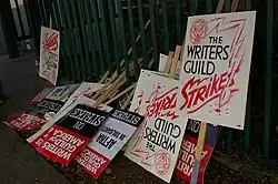 De Writers Guild of America heeft in het verleden meerdere stakingen georganiseerd. In 1988 legden 9000 schrijvers het werk van 7 maart tot en met 7 augustus neer. De James Bondfilm Licence to Kill ondervond onder andere hinder van deze staking omdat producent Michael G. Wilson genoodzaakt was het scenario zelf af te schrijven. Van 5 november 2007 tot en met 9 februari 2008 vond opnieuw een staking plaats, dit keer onder meer dan 10.000 schrijvers. Zij eisten dat de vergoeding per verkochte media als dvd's omhoog gaat. Toen in de jaren 80 de VHS-band opkwam werd door filmstudio's vastgesteld dat de schrijvers 0,3% van de opbrengst per band krijgen. De populariteit van dit medium was destijds zeer klein. Inmiddels is de dvd/video-industrie zo groot geworden (4,8 miljard omzet tegenover 1,8 miljard omzet door bioscopen) dat de schrijvers een hogere vergoeding eisen. Daarnaast kosten dvd's veel minder om te produceren dan VHS-banden. Daarnaast was een van de cruciale punten ook vergoeding voor de distributie via nieuwe media, zoals het internet. De stakingen kregen het eerst effect op Amerikaanse talkshows, die begonnen met herhalingen.