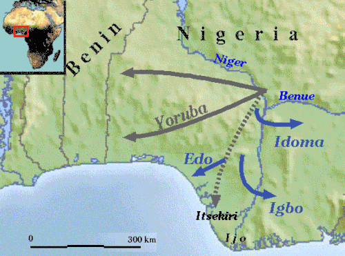Bij gebrek aan geschreven bronnen wordt wel met vergelijkende taalstudie geprobeerd te schatten in welke tijd volkeren in West-Afrika zich van elkaar zijn gaan onderscheiden. De studies van J. Greenberg worden vaak genoemd. Hij onderscheidde een oostelijke Kwagroep onder de Afrikaanse talen. Hieronder vallen de Yoruba/Igalagroep, de Nupegroep, de Edo, de Idomagroep, de Igbo en de Ijo, of Ijaw. De Tiv, Jukun en de Ibibio spreken talen die tot de zogenaamde Benue-Kongogroep behoren. Het onderscheid tussen deze twee groepen talen is niet heel scherp.