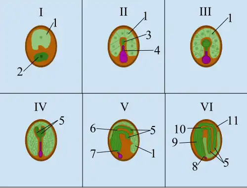 - Na dubbele bevruchting zijn het endosperm en de zygote zichtbaar.