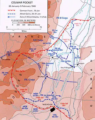 Op 20 januari 1945 startte het offensief om de zak van Colmar weg te werken en daarbij zo min mogelijk Duitsers te laten ontsnappen. Er werd vanuit het noorden en het zuiden aangevallen om zo aan beide kanten een wig te slaan tussen de Duitsers en de Rijn, waardoor terugtrekken onmogelijk zou worden. Door de zware tegenstand van de Duitsers en door de sneeuwstormen bereikten de Fransen de eerste dag niet de gestelde doelen. De tweede dag was een groot succes, maar de derde dag zetten de Duitsers een tegenaanval in. Hierna waren de gevechten zeer fel en moest dorp voor dorp worden veroverd. De Duitsers hadden echter een tekort aan materiaal. Alles wat ze hadden aan artillerie en infanterie was opgesteld. Maar ze mochten zich niet terugtrekken van Hitler.