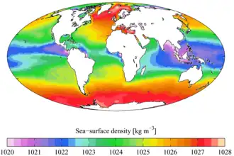 De dichtheid van zeewater is afhankelijk van temperatuur, saliniteit (zoutgehalte) en druk en varieert op open zee van 1021 tot 1027,5 kg/m³ aan de oppervlakte, toenemend van de evenaar tot de polen. In kustgebieden komen lagere waardes voor, vooral bij rivierdelta's. Op grote dieptes gaat ook de invloed van druk een rol spelen en komen dichtheden van 1070 kg/m³ voor.