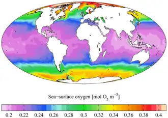 Zuurstof lost vrij goed op in water. Per liter zeewater komt er 5 tot 8 cm³ opgeloste zuurstof voor. Dit hangt af van het zoutgehalte en de temperatuur: minder bij hoge en meer bij lage temperatuur. Door het intensieve contact met de lucht zijn de bovenste waterlagen van de zee met zuurstof verzadigd. De voornaamste bron van zuurstof is echter het plantaardig plankton, het fytoplankton.