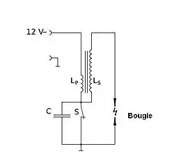 Een ander voorbeeld waar bijna iedereen dagelijks mee te maken heeft, is het ontstekingssysteem van de auto met benzinemotor. In de bobine van dit ontstekingssysteem zitten twee spoelen van koperdraad om een weekijzeren staaf, waardoor een transformator wordt gevormd. De laagspanningskant (Lp) van de transformator heeft weinig windingen van dik draad (de primaire spoel); de hoogspanningskant (Ls) heeft veel wikkelingen van dun draad (de secundaire spoel). Op de laagspanningskant komt na het starten een gelijkspanning van 12 V te staan. Door het snelle openen van de onderbreker S in de stroomverdeler - waardoor dus de gelijkstroomkring wordt afgeschakeld - wordt er in de primaire spoel van de bobine door zelfinductie een pulsvormige spanningspiek van circa 800 V opgewekt. In de secundaire spoel (Ls) wordt deze spanning verder omhoog getransformeerd. Dit leidt samen met de condensator tot resonantie, waardoor opslingering van de spanning ontstaat en de spanning tot circa 15 kV oploopt. Deze hoogspanning wordt, eventueel via de verdeler, naar de bijbehorende bougie geleid, die dan tot overslag komt (de bougie vonkt), waardoor het brandstofmengsel in de cilinder wordt ontstoken.