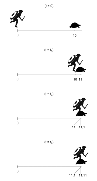 De snelvoetige Achilles gaat een wedstrijd aan met een schildpad. De schildpad krijgt een voorsprong. Wanneer Achilles het punt A bereikt, waar de schildpad kort tevoren was, is de schildpad intussen bij punt B aangekomen. Arriveert Achilles bij dit punt B, dan is de schildpad intussen aangekomen bij punt C, enzovoorts.
