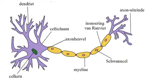 Een zenuwcel heeft een cellichaam of soma, en een aantal lange dunne uitlopers. Globaal genomen zijn er twee soorten uitlopers: axonen en dendrieten. Axonen geleiden van de zenuwcel af, dendrieten er (meestal) naartoe. Het axon is vaak erg lang (tot een meter), veel dikker (25 micrometer) dan dendrieten, en onvertakt, behalve aan het uiteinde; de dendrieten zijn dun en sterk vertakt. Een purkinjecel in de hersenschors kan door middel van dendrieten met duizenden andere zenuwcellen verbonden zijn.