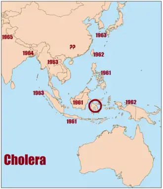 De wereldwijde epidemie begon op Sulawesi en verspreidde zich eerst over Indonesië en de Filipijnen. Van daar verspreidde de ziekte zich: in 1964 bereikte ze India en in 1965 Iran. Daarna leek een einde te zijn gekomen aan de opmars van de epidemie, maar in 1969 meldden 17 landen gevallen van cholera. Er werden in dat jaar 27.277 ziektegevallen en 4.418 overlijdens gemeld. In 1970 kwamen er al uit 37 landen cholerameldingen, terwijl niet alle landen uitbraken meldden bij de Wereld Gezondheidsorganisatie uit vrees voor beperkingen van de handel en het personenverkeer. In Europa waren er in 1970 haarden in de voormalige Sovjet-Unie en Slowakije, die echter al snel onder controle waren. In Afrika kwamen er meldingen uit elf landen.