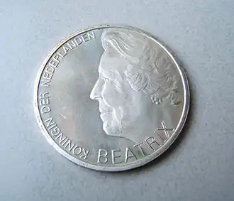 - Voorzijde: twaalf ellipsvormige ringen met klein portret koningin Beatrix daarboven.