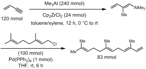 Zirkonoceendichloride katalyseert de carboaluminering van alkynen door trimethylaluminium waarbij alkenyldimethylalanen gevormd worden. Deze vormen op hun beurt de basis voor drievoudig gesubstitueerde akenen. Zo kan het α-E,E-farneseen (één van de vier isomeren) zuiver bereid worden in een opbrengst van bijna 70% over-all in de reactie van 1-buten-3-yn met trimethylaluminium, gevolgd door de palladium gekatalyseerde reactie van het product met geranylchloride.[6]