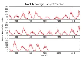 Het aantal zonnevlekken die zichtbaar zijn op de zon is niet constant, maar varieert over een 11-jarige cyclus, die de zonnecyclus genoemd wordt.