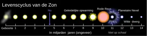 | 4,59 (=nu) | 1,000 | 1,000 | 5770 | 147 | 15,5×106 | 35,5% | de huidige zon |