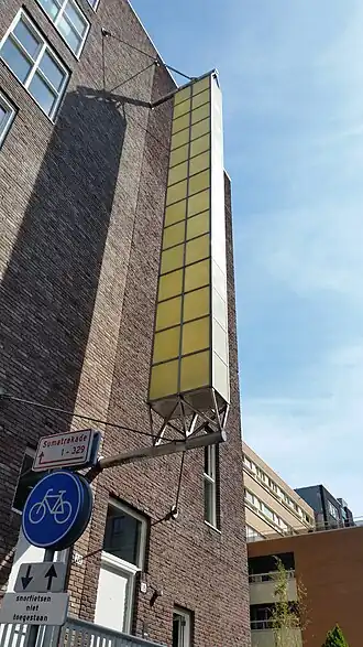 Het gaat daarbij om in 2000 geplaatste metalen frames, die als een uithangbord aan gevels hangen. Ze kregen in de volksmond de titel Violet en geel. De roestvast stalen frames zijn opgevuld met kunststof paneeltjes, die aan de binnenzijde beschilderd zijn. Het ene (nabij Lamonggracht ingang Imogirituin) is violet geschilderd; het andere (op de hoek van de Seranggracht en de Bogortuin) is geel. De kunstenaar gaf aan dat het complementaire kleuren zijn; in het kleurenspectrum staan ze tegenover elkaar. Violet is een samengesteld kleur (rood en blauw); geel is een primaire kleur. Bij menging van violet en geel licht ontstaat wit licht. De kunstenaar heeft dat vermeden want de twee frames zijn nauwelijks in een zelfde blik te vangen; er zit een knik in het voet- en fietspad. Staande aan de Majanggracht zijn beide frames wel te zien, maar daarvoor moet de kijker zich omdraaien.