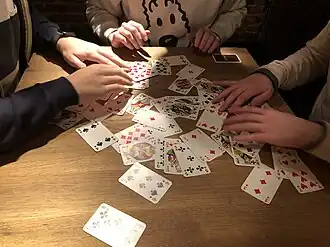 Het spel wordt gespeeld met een normaal kaartspel van 52 kaarten. Het is noodzakelijk dat alle spelers goed bij de kaarten kunnen, waardoor een vierkante of ronde tafel het meest geschikt is.