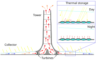 Lucht wordt opgewarmd door zonnewarmte onder een laag cirkelvormig doorschijnende collector die aan de rand open is. Zo vormt het doorschijnende dak samen met de grond een opslagruimte voor door de zon opgewarmde lucht. In het midden van de cirkel staat een verticale toren, die aan de basis een grote doorsnede heeft. Omdat hete lucht lichter is dan koude lucht, stijgt deze op door de toren: het 'schoorsteeneffect'. De toren zuigt meer lucht aan en er wordt nieuwe koude lucht aangevoerd aan de rand van de opslagruimte. Een continue stroom van lucht kan bereikt worden door met water gevulde buizen of zakken onder het dak te plaatsen. Overdag warmen deze op en ’s nachts geven ze hun warmte af. Zo is er sprake van een continue stroom veroorzaakt door zonnewarmte. De energie die ontstaat bij deze opwaartse stroom lucht wordt door windturbines omgezet in mechanische energie en met generatoren wordt deze mechanische energie omgezet in elektrische energie. Een prototype is in Spanje gebouwd, welk positieve resultaten opleverde.