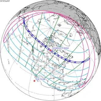 De totale zonsverduistering van 10 juli 1972 trok veel over zee en was achtereenvolgens te zien in deze elf deelgebieden:[1][2]