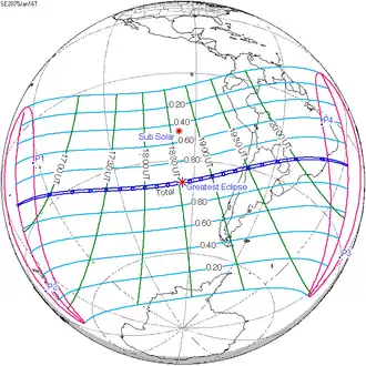 De totale zonsverduistering van 16 januari 2075 trekt veel over zee, maar is op land zichtbaar vanuit deze zes gebieden : [1][2]