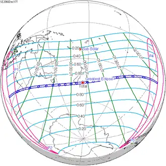 Het punt met maximale totaliteit ligt op zee ten zuidoosten van Nieuw-Zeeland en duurt 3m14,4s.