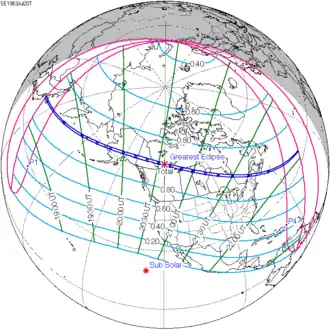 De totale zonsverduistering van 20 juli 1963 trok veel over land en zee en was achtereenvolgens te zien in deze twaalf deelgebieden: Japan, Rusland, Alaska, Yukon, Northwest Territories, Alberta, Saskatchewan, Manitoba, Ontario, Quebec, Maine en Nova Scotia.[1][2]