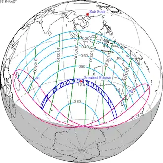 De totale zonsverduistering van 20 juni 1974 trok veel over zee, maar was achtereenvolgens te zien in de deelgebieden Amsterdam (Frans eiland) en West-Australië.[1][2]