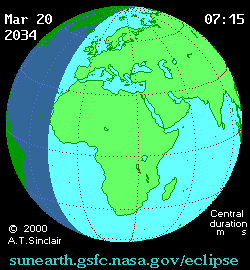 De totale zonsverduistering van 20 maart 2034 zal achtereenvolgens te zien zijn in de volgende dertien landen: Benin, Nigeria, Kameroen, Tsjaad, Soedan, Egypte, Saoedi-Arabië, Koeweit, Iran, Afghanistan, Pakistan, India en China.[1][2]