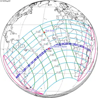 De totale zonsverduistering van 20 mei 1947 trok veel over land en achtereenvolgens te zien in deze landen en gebieden:[1][2]