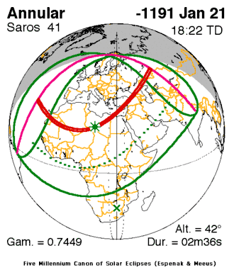 Omdat de historische tijdschaal geen, maar de astronomische schaal wél een jaar nul kent, spreken astronomen van de zonsverduistering van 21 januari -1191[2] Het pad van de verduistering, die tot saros 41 behoorde, voerde over het nabijgelegen Cyprus naar zuidelijk Turkije en bedekte de zon in Ugarit voor ca. 91%.