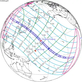 De totale zonsverduistering van 24 augustus 2063 zal achtereenvolgens te zien zijn in de volgende zeven landen: China, Mongolië, Noord-Korea, Rusland, Japan, Malden (Kiribati) en Frans-Polynesië.[1][2]