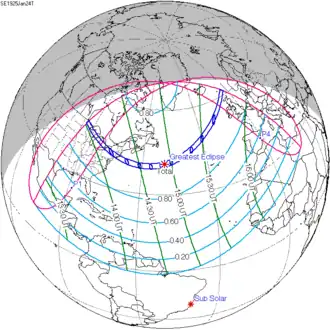 De totale zonsverduistering van 24 januari 1925 trok veel over zee, maar was achtereenvolgens te zien in deze tien noordelijk Amerikaanse gebieden: Ontario, Minnesota, Wisconsin, Michigan, Pennsylvania, New York, New Jersey, Connecticut, Massachusetts en Rhode Island.[1][2]