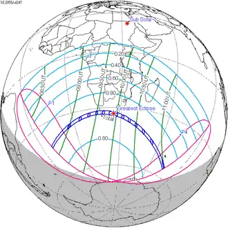 De totale zonsverduistering van 24 juli 2055 trekt veel over zee, maar is op land zichtbaar vanuit Zuid-Afrika. [1][2]