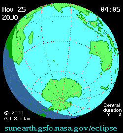 De totale zonsverduistering van 25 november 2030 trekt veel over zee, maar zal achtereenvolgens ook te zien zijn in de landen Namibië, Botswana, Zuid-Afrika, Lesotho en Australië.[1][2]