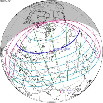 De totale zonsverduistering van 29 juni 1927 trok veel over zee, maar was achtereenvolgens te zien op of in deze zeven (ei)landen: Engeland, Noorwegen, Zweden, Finland, Bolsjevik, Rusland en Amukta.[1][2]