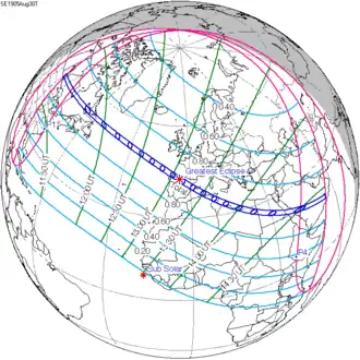 De totale zonsverduistering van 30 augustus 1905 trok veel over zee, maar was achtereenvolgens te zien in deze dertien gebieden:[1][2]