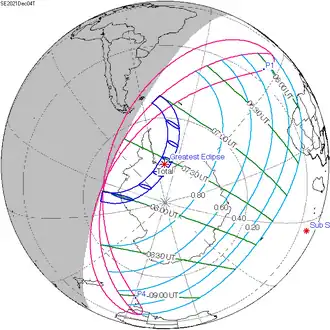 De totale zonsverduistering van 4 december 2021 trok veel over zee, maar was achtereenvolgens te zien op het eiland Coronation in de Zuidelijke Orkneyeilanden en op Antarctica.[1][2]