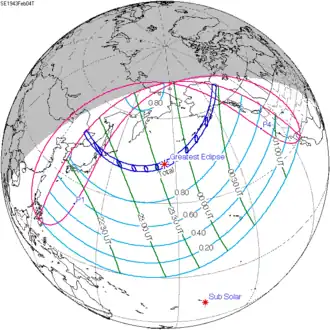 De totale zonsverduistering van 4 februari 1943 trok veel over zee, maar was achtereenvolgens te zien in deze vijf gebieden: China, Rusland, Japan, Alaska en Yukon.[1][2]