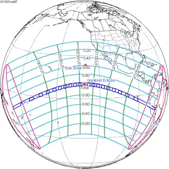 De totale zonsverduistering van 8 juni 1937 trok veel over zee, maar was achtereenvolgens te zien op of in deze zeven (ei)landen: Vaitupu, Tuvalu, Nikumaroro, Hull-eiland, Kantoneiland, Enderbury en Peru.[1][2]