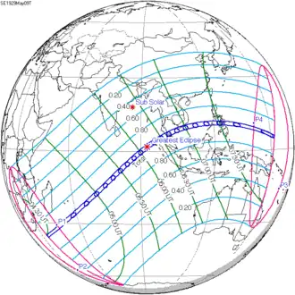 De totale zonsverduistering van 9 mei 1929 trok veel over zee, maar was achtereenvolgens te zien in deze vijf landen: Indonesië, Maleisië, Thailand, Vietnam en Filipijnen.[1][2]