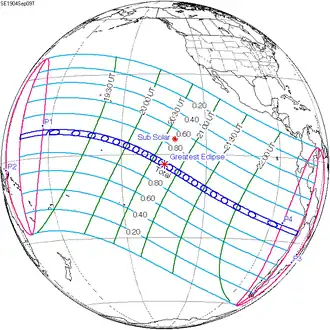 De totale zonsverduistering van 9 september 1904 trok nagenoeg alleen over zee, maar was bij zonsondergang voor heel even te zien in Chili.[1][2]