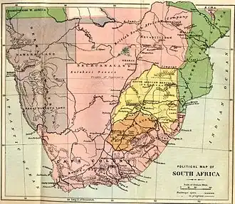 In 1885 stond de ZAR onder druk de westelijke protectoraten Stellaland en Goosen af aan het Verenigd Koninkrijk, dat Beetsjoeanaland tot Brits protectoraat uitriep.[83] Alleen in het oosten kon nog enige gebiedsexpansie plaatsvinden: de Nieuwe Republiek en Klein Vrystaat werden in respectievelijk 1888 en 1891 door de ZAR ingelijfd en in 1894 werd Swaziland een protectoraat van de ZAR, al werd directe toegang tot de Indische Oceaan door het Verenigd Koninkrijk verhinderd.[84]