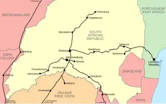 In 1883 werd het Driemanschap ontbonden en streden de conservatieve Kruger en de progressieve Joubert om het staatspresidentschap. Kruger won de verkiezing en zou zijn eeuwige rivaal Joubert nog driemaal verslaan, in 1888, 1893 en 1898. Onder Kruger werd het oude idee van de spoorlijn naar Lourenço Marques in Portugees-Oost-Afrika weer van stal gehaald en ook daarin speelden Nederlanders een belangrijke rol. Na een lange zoektocht naar investeerders werd op 21 juni 1887 de Nederlandsch-Zuid-Afrikaansche Spoorwegmaatschappij (NZASM) opgericht,[75] die op even moeizame wijze aan het grote karwei begon. De NZASM dreigde ten onder te gaan aan geldnood, maar kon in 1892 worden gered dankzij een lening van de Rothschilds.[76] Naast Portugees-Oost-Afrika werden er plannen gemaakt voor een verbinding met de Kaapkolonie, via de Oranje Vrijstaat,[77] en de Natalkolonie.[78]