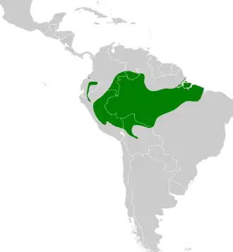 De leefgebieden liggen in vochtig, tropisch bos, ook permanent onder water staand bos in laagland onder de 500 meter boven zeeniveau. De populaties die voorkomen in het voorgebergte van de Andes zijn waargenomen tot op 1700 meter. [1]