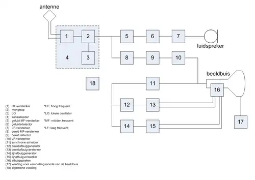 Het signaal aan de uitgang van de kanaalkiezer wordt door de beeldmiddenfrequentversterker tot 10.000 maal versterkt, zodat het door de beelddetector kan worden waargenomen. Omdat de beeldinformatie opgebouwd is in het laagfrequente gebied, zal het middenfrequent gemoduleerd signaal door de beelddetector tot een laagfrequent signaal worden omgevormd. De laagfrequentversterker versterkt het beeldsignaal tot een vermogen dat voldoende groot is om de luminantie-informatie zichtbaar te maken op het beeldscherm en de beeldafbuiggenerator en lijnafbuiggenerator aan te sturen.