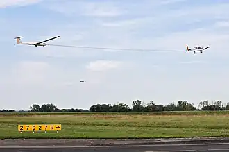 Het zweefvliegtuig wordt door middel van een lierkabel voortgesleept, en nadat het losgekomen is van de grond "omhoog gelierd".