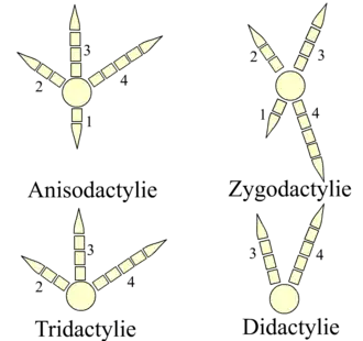 Het komt echter het meest voor bij vogels, namelijk bij de klimmende soorten. Dit betekent dat de vogel vier tenen heeft. Twee tenen aan weerszijden van de poot, deze worden samen gebruikt. De vogel oefent hiermee grip uit op de oppervlakte waar deze op beweegt. De meeste spechten (inclusief de draaihals), papegaaien, koekoeken (inclusief de renkoekoeken) en sommige uilen hebben dit. Niet alle klimmende vogels plaatsen hun tenen in deze verhouding, er zijn uitzonderingen zoals de drieteenspecht.